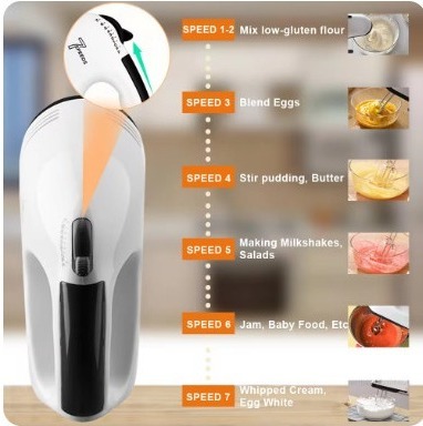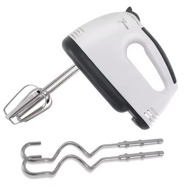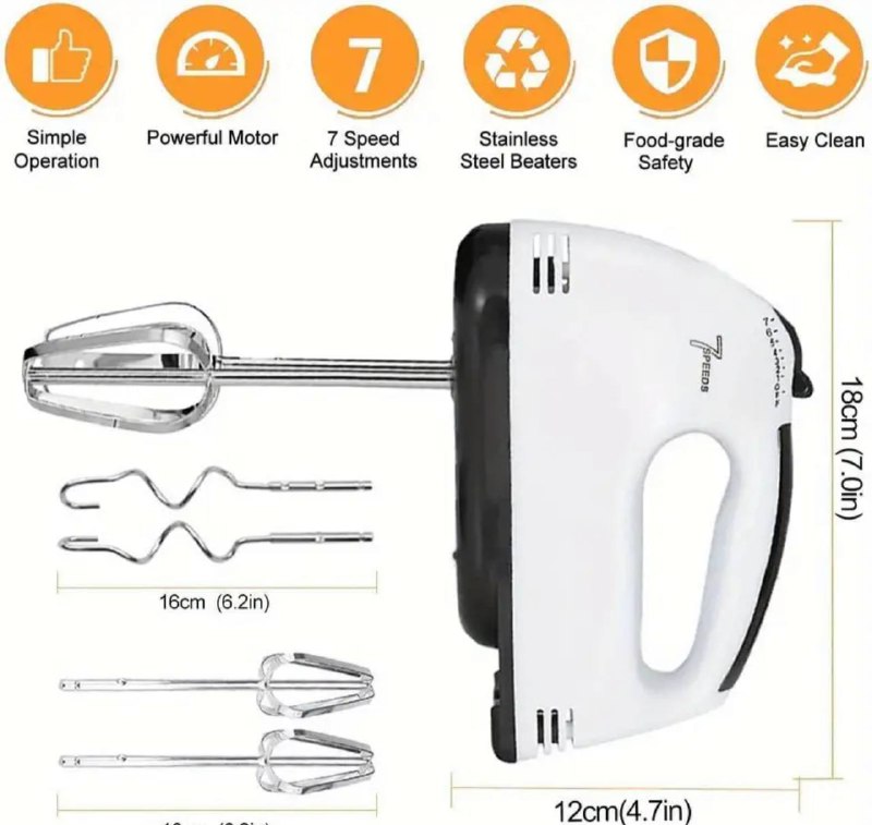 Diseño ergonómico y moderno que facilita el manejo y almacenamiento. Incluye un juego de accesorios, como varillas y ganchos, adaptables a diversas preparaciones. Funciona con 7 niveles de velocidad, permitiendo una mezcla precisa para diferentes recetas.